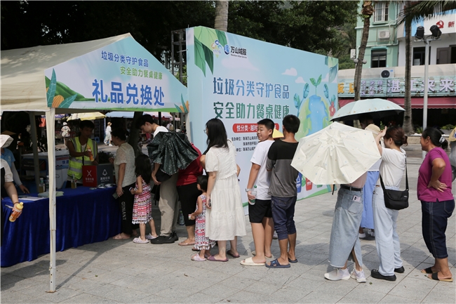 活动现场以鲜明设计营造氛围:入口主题背景板醒目传递活动信息;礼品兑换处备有洗洁精、洗衣液等实用礼品,参与者凭互动游戏可抽奖,两大特色游戏融合知识与趣味:“分类趣味扔沙包” 让大家在运动中学习分类知识,提升投放正确率;“食品安全消消乐” 通过卡片游戏,强化对海鲜壳等海岛特色厨余垃圾的识别能力。