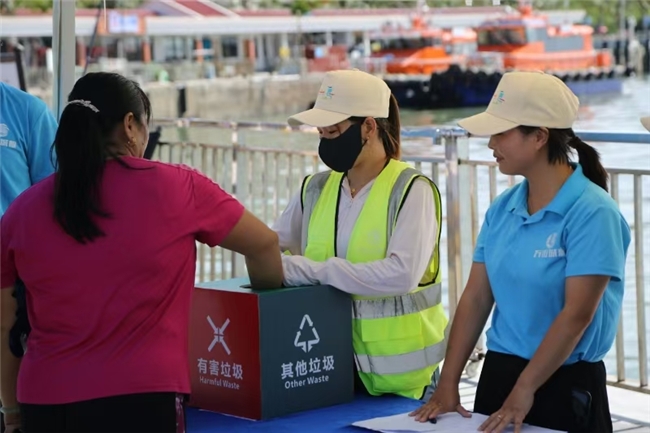 在桂山镇码头,工作人员向居民群众发放《桂山镇垃圾分类投放指引》。码头作为海岛交通的关键枢纽,是村民出海、归港的必经之地,也是游客登岛的首站。在此处发放指引单,如同为垃圾分类宣传筑牢了“第一道防线”,为扩大宣传覆盖面、提升宣传效果奠定了坚实基础。