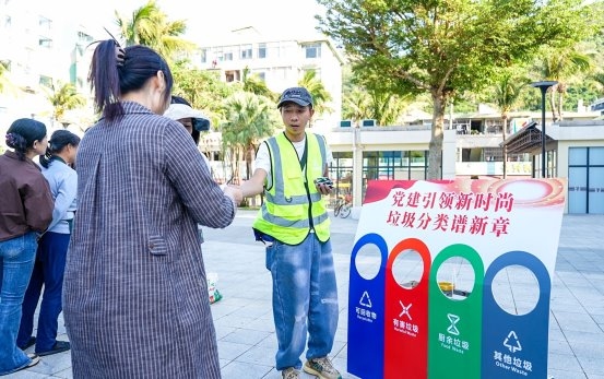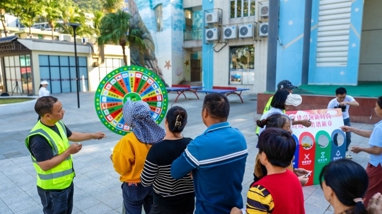趣味互动区化身普及垃圾分类知识的“移动课堂”,将原本枯燥的分类知识变得生动易懂。“废旧电池属于哪类垃圾?”“外卖餐盒该怎么分?”在知识问答区,居民游客排起长队踊跃答题;模拟投放区里,大家在工作人员的指导下,将标有不同垃圾名称的沙包精准投入对应垃圾桶,活动特别设置“参与即有礼”环节,定制环保袋、分类收纳盒等实用小礼品,极大调动了群众的参与热情。此外,工作人员还向现场群众派发垃圾分类投放指引手册,不少居民游客驻足领取、咨询海岛分类特殊要求,工作人员细致解答,互动氛围浓厚。