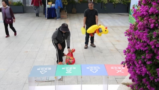 活动现场布置将“悦分类越时尚志愿珠海”的核心理念与海岛元素巧妙融合。互动体验区人气爆棚,“赶‘圾’入笼”游戏不仅考验分类知识,更特别加深了在游戏中的环保参与理念。 完成体验的参与者可抽取牙膏、抽纸、洗洁精、洗衣液等实用礼品,贴心的设置让岛民和游客都感受到了满满的诚意。